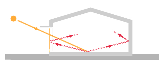 En los edificios el sol entra a través de las ventanas. Al atravesar el vidrio, la radiación solar calienta los objetos que hay dentro de la vivienda. Estos, a su vez, emiten radiación infrarroja, con una longitud de onda mayor que la solar. Ese cambio de longitud de onda hace que la radiación no pueda atravesar los vidrios en la dirección de salida, quedando atrapada en el interior, y causando un aumento de temperatura. Es el conocido «efecto invernadero».